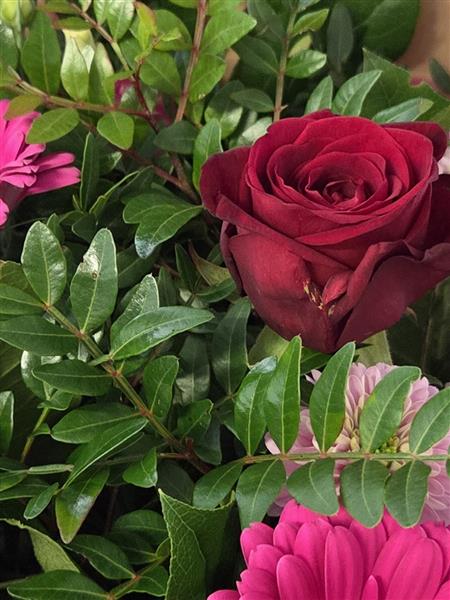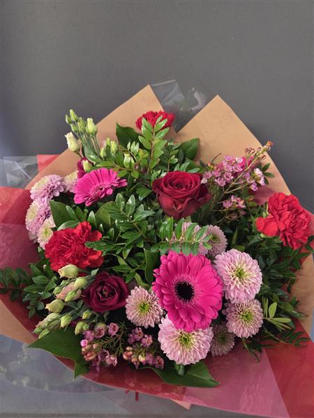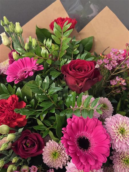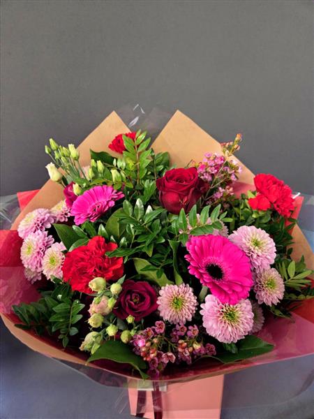Our vibrant valentines bouquet of pink and red flowers, including a red rose. These flowers are delivered in water, stylishly gift wrapped and presented in a gift box.