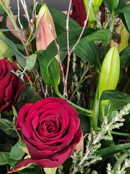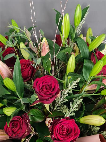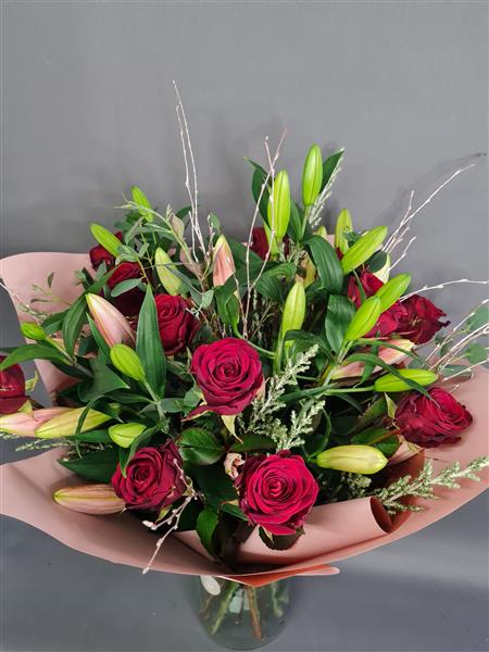 An absolutely stunning bouquet of perfumed lilies and large headed red roses, surrounded by seasonal foliages.