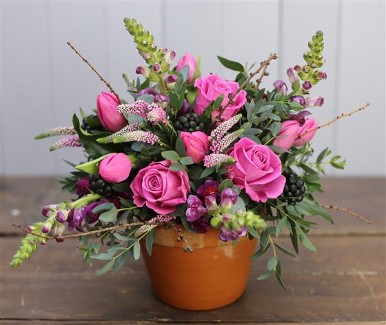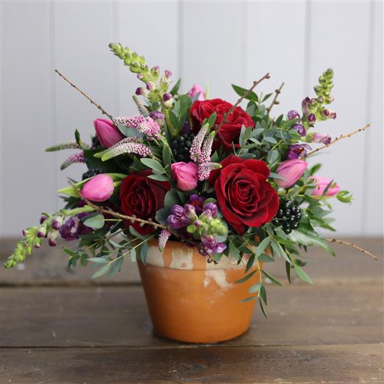 A fully lined and water tight terracotta pot bursting with gorgeous red roses and seasonal flowers. Delightful