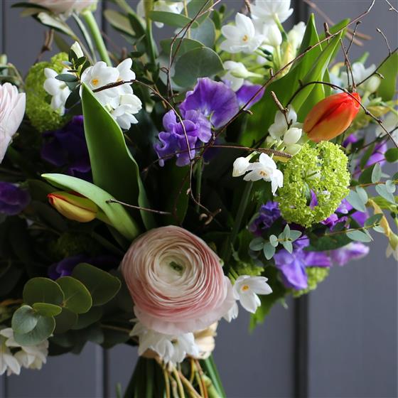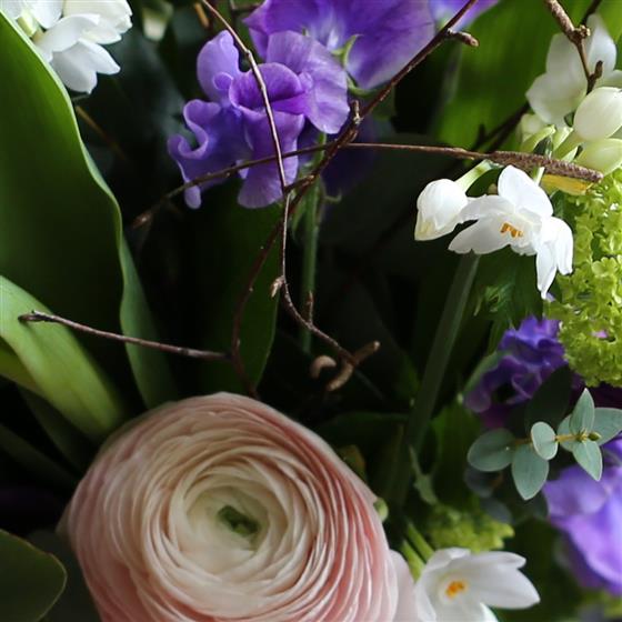 Scented Narcissus, ranunculus and seasonal fillers and foliage make this a charming small bouquet. Colours may vary.