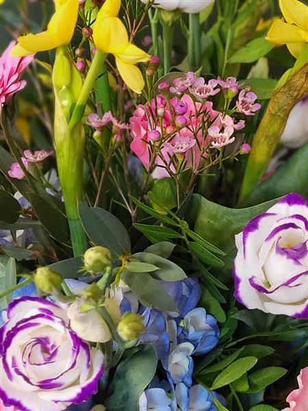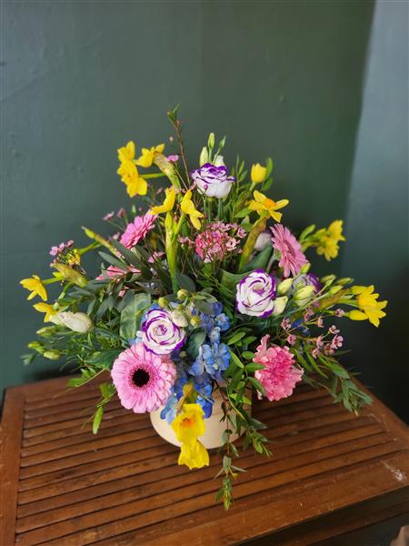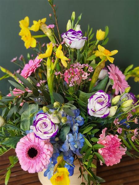 This arrangement is packed with seasonal spring flowers. Colourful and full of perfume.